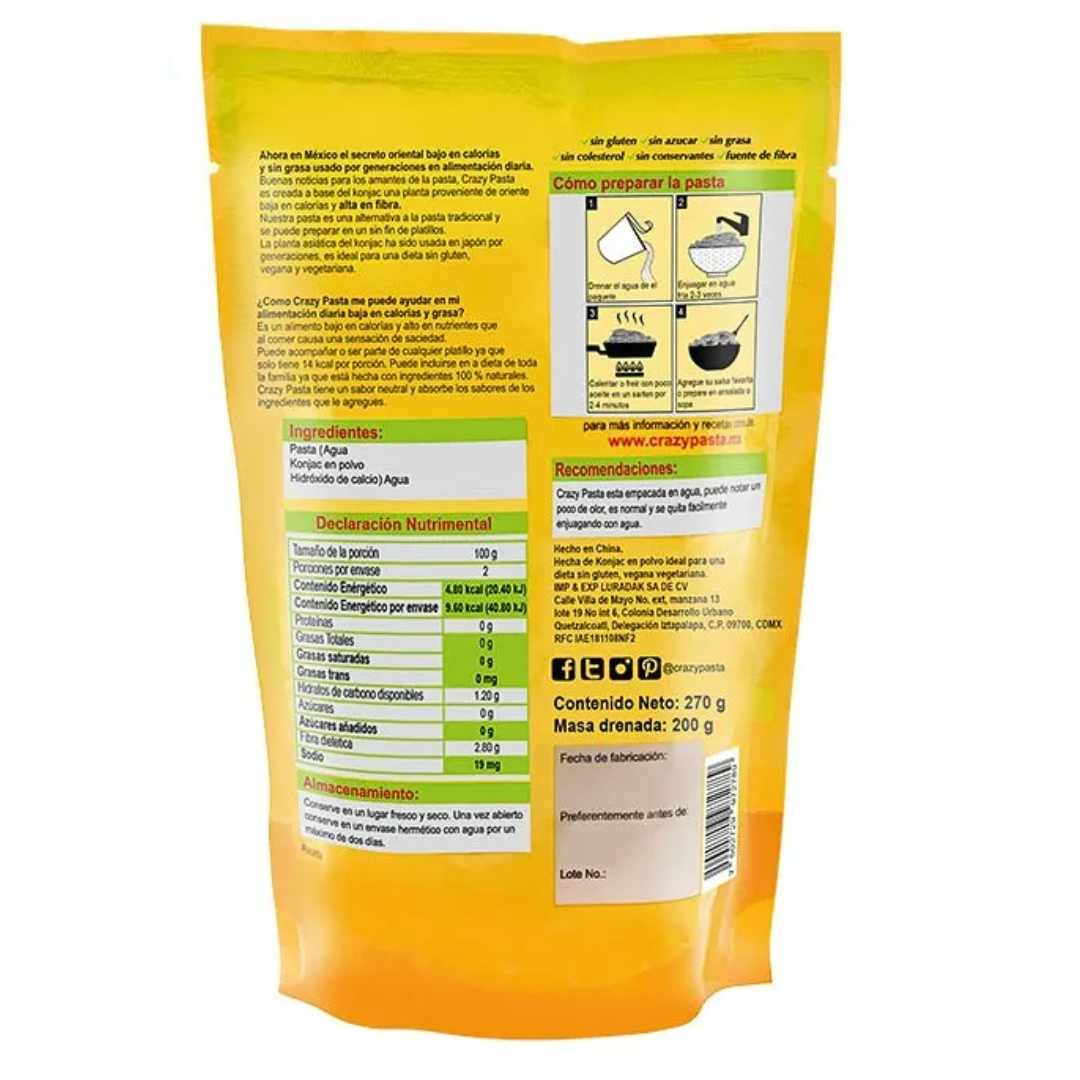 Porción recomendada no más de 90gr, 100% fibra de Glucomannan/Konjac/Shiritaki